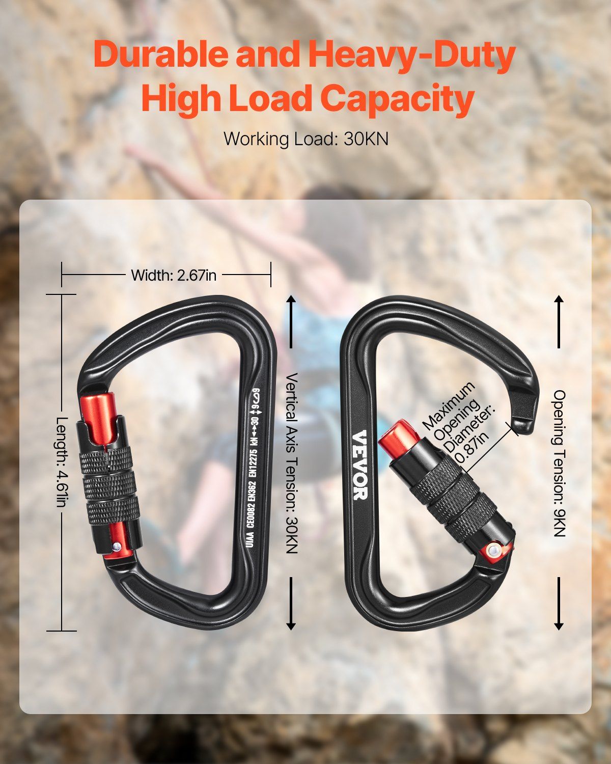 1.Durable and Strong: The heavy duty carabiner is made of premium 7075 aerospace-grade aluminum, ensuring strength, durability, and rust resistance. The main axis strength is 30kN (6744 lbs), with a lateral load of 9kN (2023 lbs) and an open-load strength of 9kN (2023 lbs). The classic D-shape design directs most of the load to the spine, providing enhanced safety and reliability